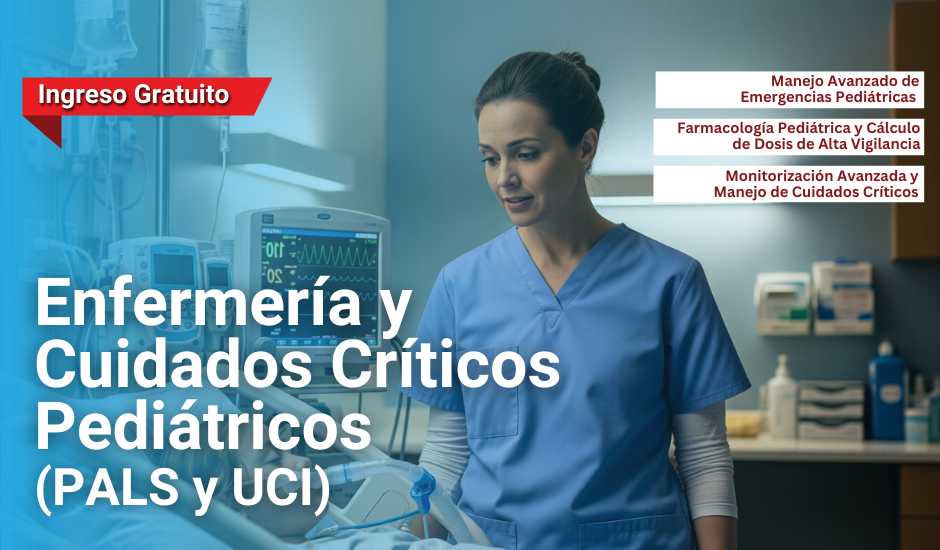 Especialízate en Enfermería y Cuidados Críticos Pediátricos, un curso enfocado en el manejo avanzado de emergencias, farmacología pediátrica con cálculo seguro de dosis, prevención de infecciones nosocomiales, valoración del dolor y confort, soporte nutricional especializado y monitorización avanzada. Desarrolla habilidades clave para brindar una atención segura, oportuna y de alta calidad al niño hospitalizado.